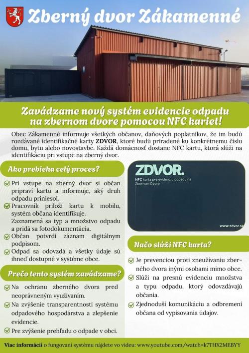 Zberný dvor je umiestnený v oplotenom areáli obce Zákamenné na Hlavnej ulici, súpisné číslo 311/79 (v blízkosti Roľníckeho družstva). Je prevádzkovaný obcou Zákamenné. Je určený pre obyvateľov obce Zákamenné. Zber odpadov je vykonávaný priamym prevzatím od obyvateľov obce počas jeho otváracích hodín. Pri odovzdaní odpadov na zberný dvor, si pracovník zberného dvora zaeviduje totožnosť osoby, ktorá odpad odovzdá, ako aj množstvo a druh odpadu.
