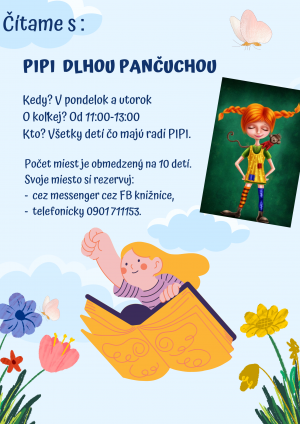 Pozývame všetky deti, ktoré majú radi Pipi dlhú pančuchu na príjemné posedenie pri čítaní knihy, ktoré sa uskutočni v pondelok 27.2.2023 a utorok 28.2.2023 od 11:00-13:00 hod. v obecnej knižnici Zákamenné.