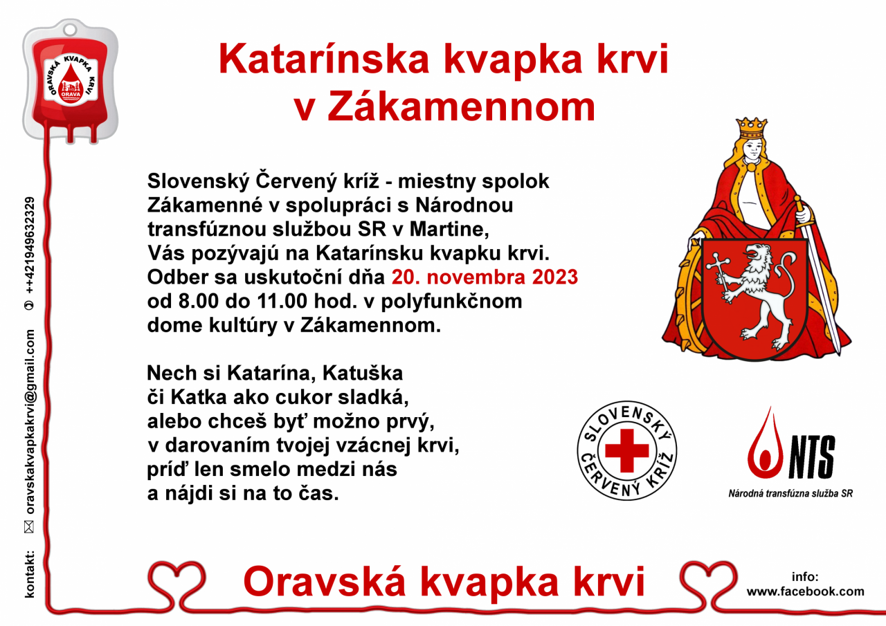 Katarínska kvapka krvi v Zákamennom 20. novembra 2023 od 8:00-11:00 hod. v polyfunkčnom dome kultúry v Zákamennom.
