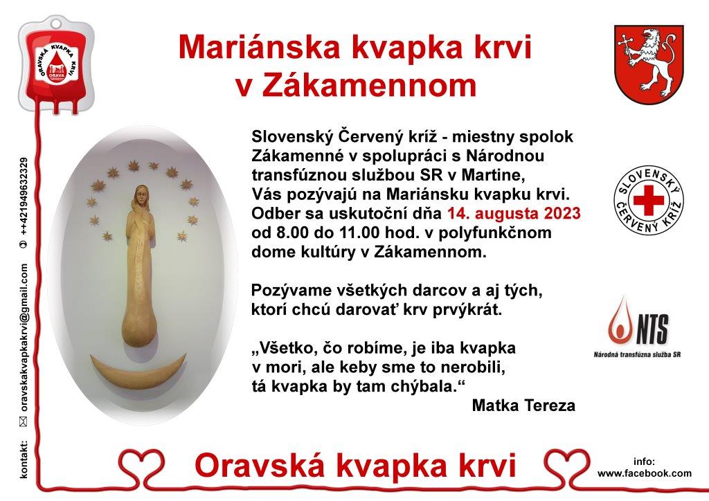Slovenský Červený kríž- miestny spolok Zákamenné v spolupráci s Národnou transfúznou službou SR v Martine, srdečne pozývajú všetkých darcov a aj tých, ktorí chcú darovať krv prvý krát na darovanie krvi, ktoré sa bude konať 14. augusta 2023 od 8:00 do 11:00 hod. v polyfunkčnom dome kultúry v Zákamennom.