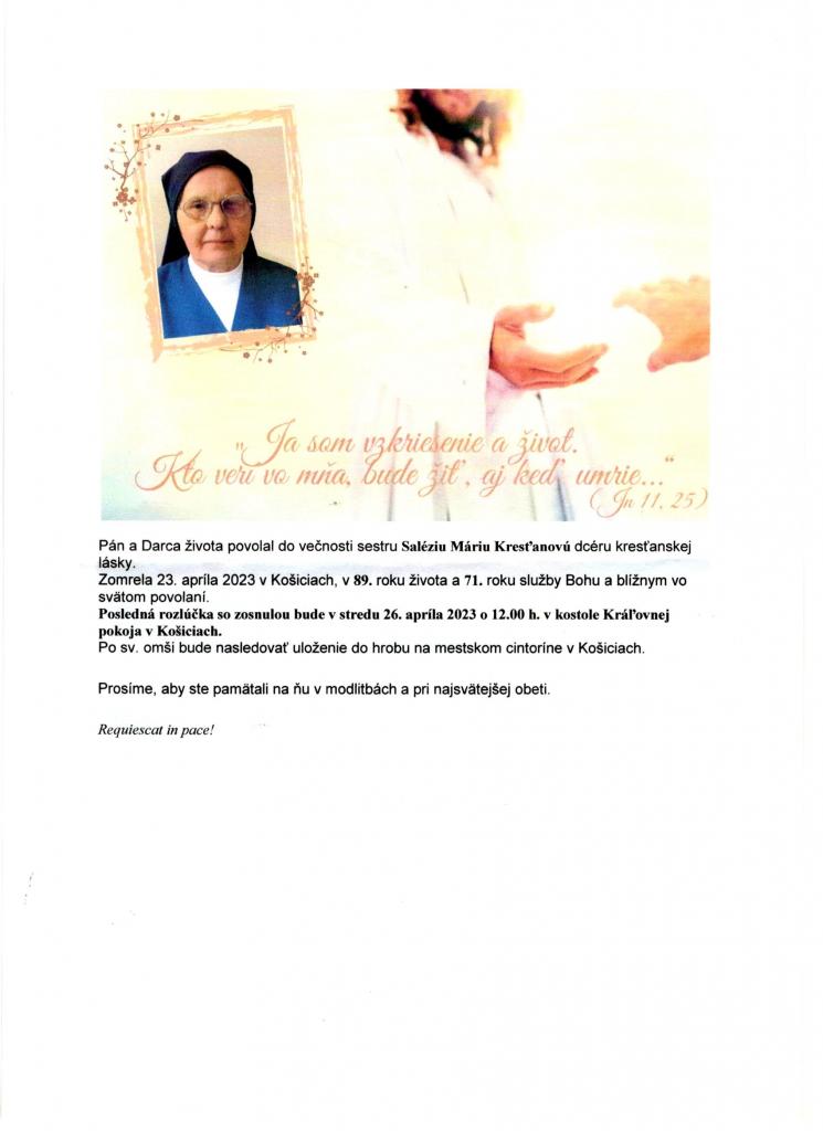 Pán Darca života povolal do večnosti sestru Saléziu Máriu Kresťanovú dcéru kresťanskej lásky. So zosnulou sa lúčia bratia Štefan, Emil s rodinami, sestra Marta s rodinou, rodina Čičová, rodina Farbáková, susedia, známi a ostatná rodina.