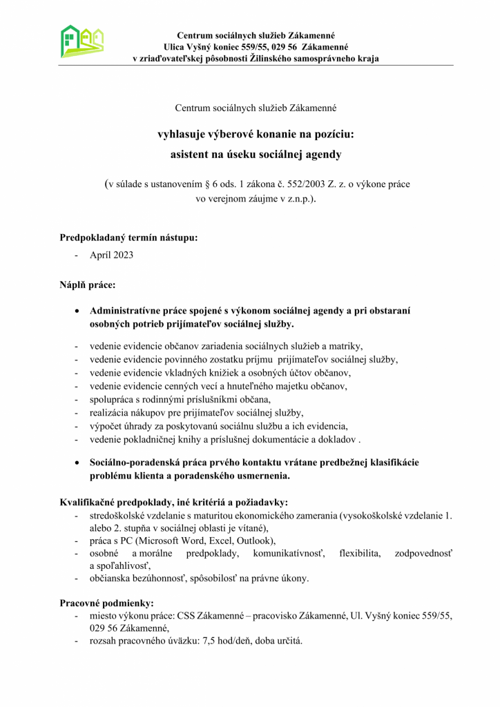 Výberové konanie na pozíciu asistent na úseku sociálnej agendy